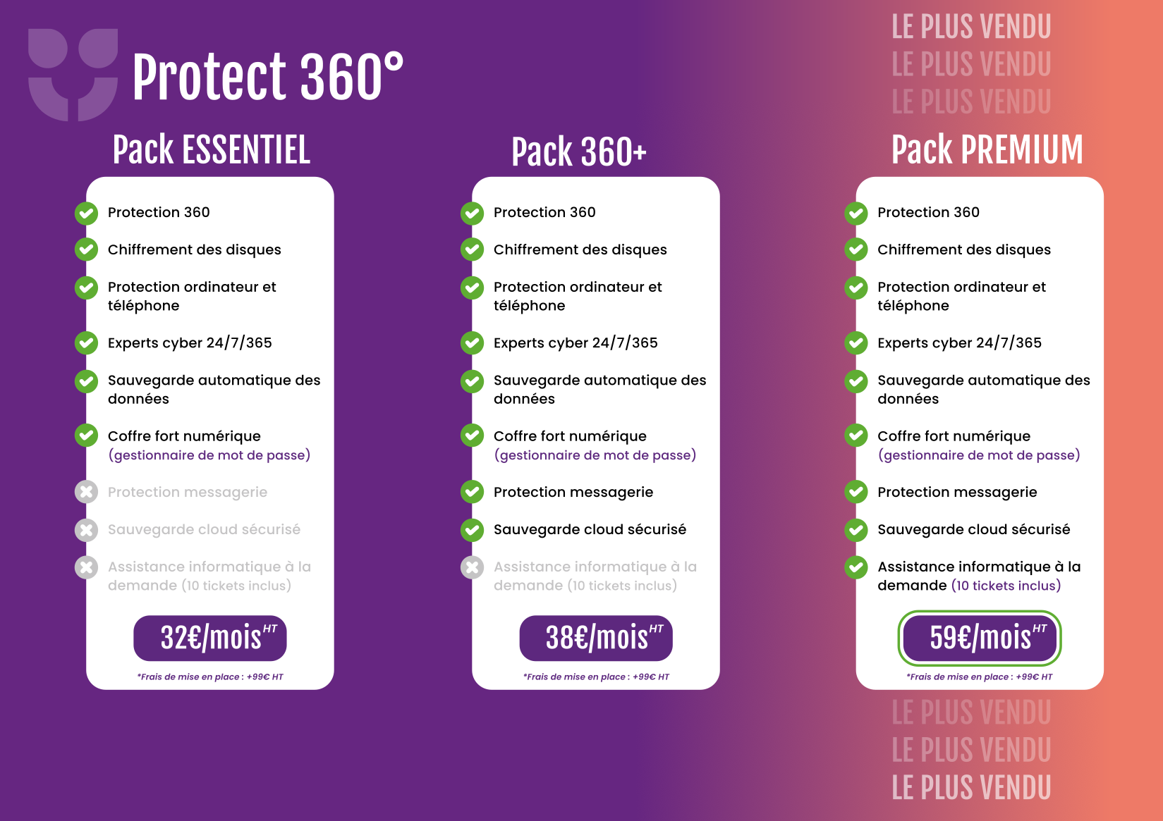 Inclut la protection unifiée des postes, sauvegarde sécurisée, protection messagerie, gestionnaire de mots de passe et assistance en cas d'incident.